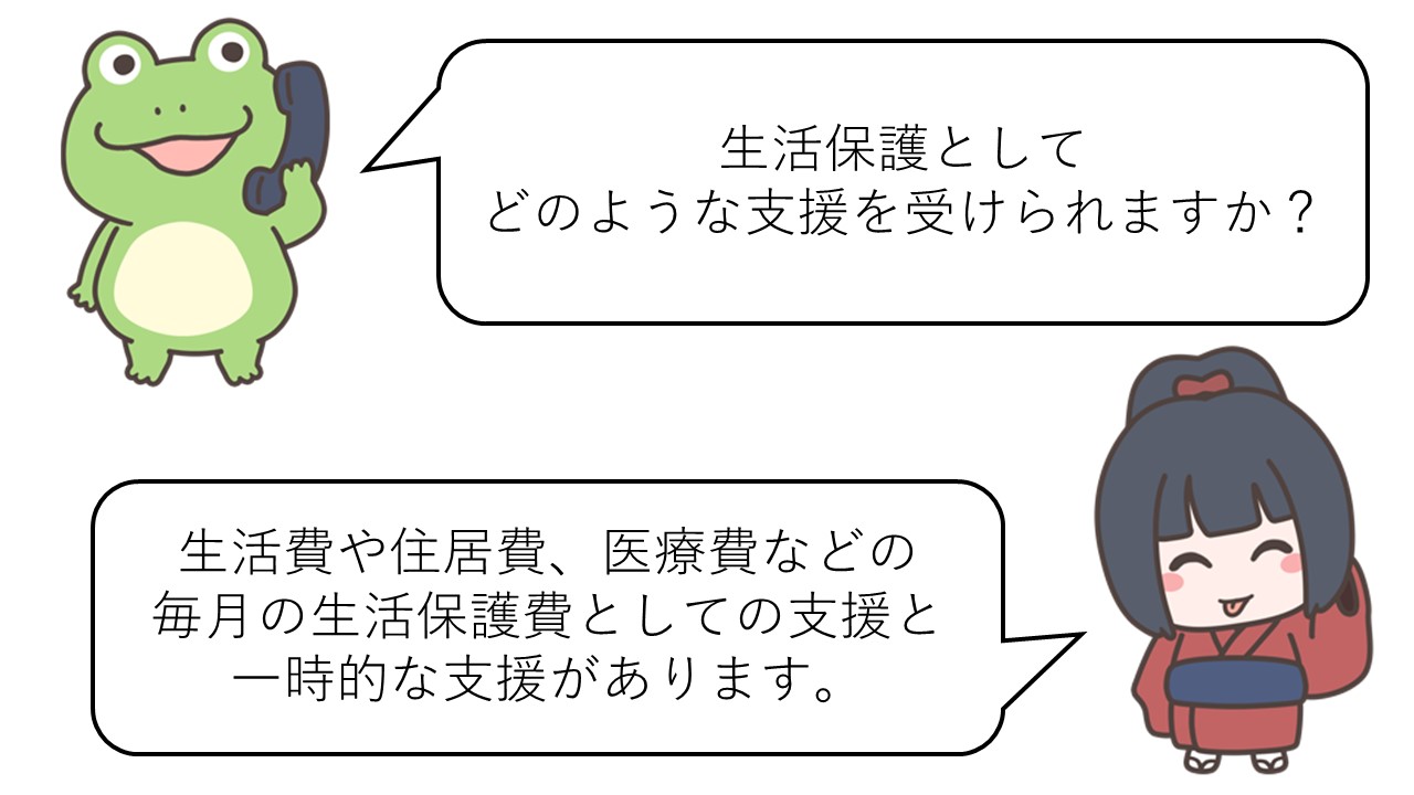 【回答】生活費や住宅費、医療費等の「毎月の支援」と「一時的な支援」を受けることができます。